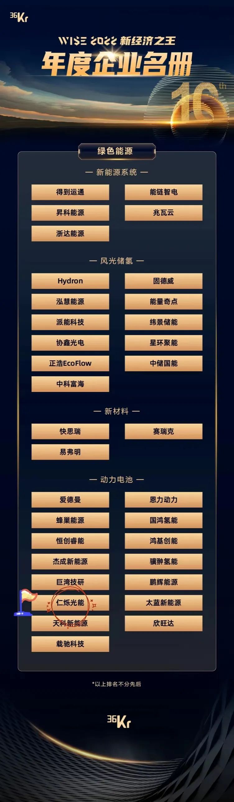 三行资本已投企业仁烁光能(苏州)有限公司(以下简称“仁烁光能”)从近千家企业中脱颖而出,成功入选该榜单绿色能源领域动力电池板块,成为该板块15家上榜企业之一。