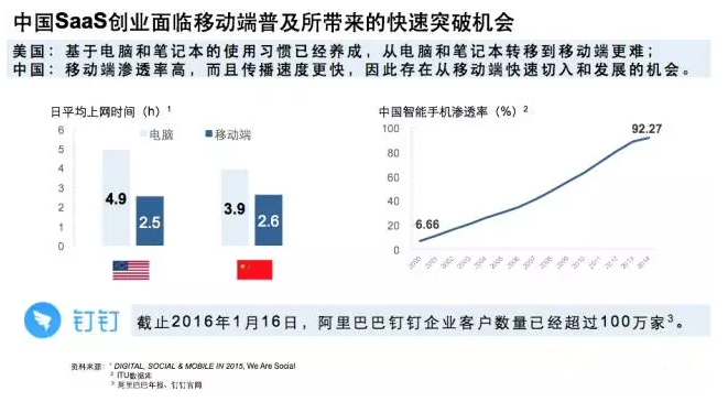 在美国我们看到基于笔记本和电脑端的SaaS软件应用,发展大都很成熟,而只要是跟电脑、笔记本相关的SaaS软件,很难快速实现口碑相传。在中国恰恰很有趣,我们在移动端的日使用时间比美国还要多一些,但是Web端日平均上网仍要低不少。因此,中国的SaaS公司不需要从Web端慢慢往移动端切,而是齐头并进,甚至反过来从移动端直接来切。