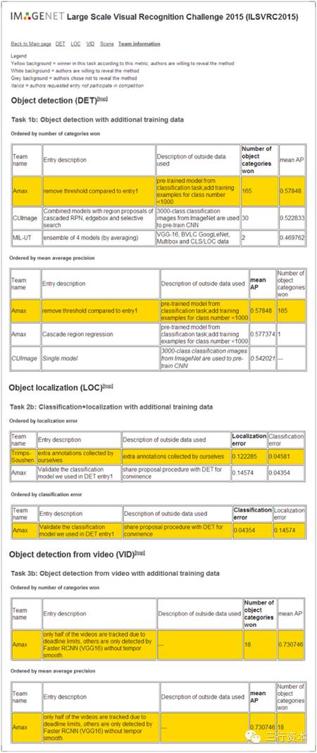 在所有ImageNet2015任务中,目标检测最具挑战性,难度最大。在可加入额外训练数据的图像目标检测评测竞赛中,Amax团队在按成功检测出的目标类别数、按平均准确率、按分类错误率这三类排名中都获得了第一名。值得一提的是,“视频中物体检测”是今年ImageNet的新增比赛任务,需要在运动的连续视频中检测物体位置、同时识别物体类别,堪称此次比赛中难度最大的领域,其对于工业界的实用价值也极强,反映了市场的需求。Amax在可加入额外训练数据的视频目标检测评测竞赛中,同样在成功检测出目标类别数排名、平均准确率排名中都取得第一名。其中平均检测准确率超过73%,而在四年前的首届ImageNet比赛中,冠军对于难度更小的静态图片物体的检测准确率也仅为8%。