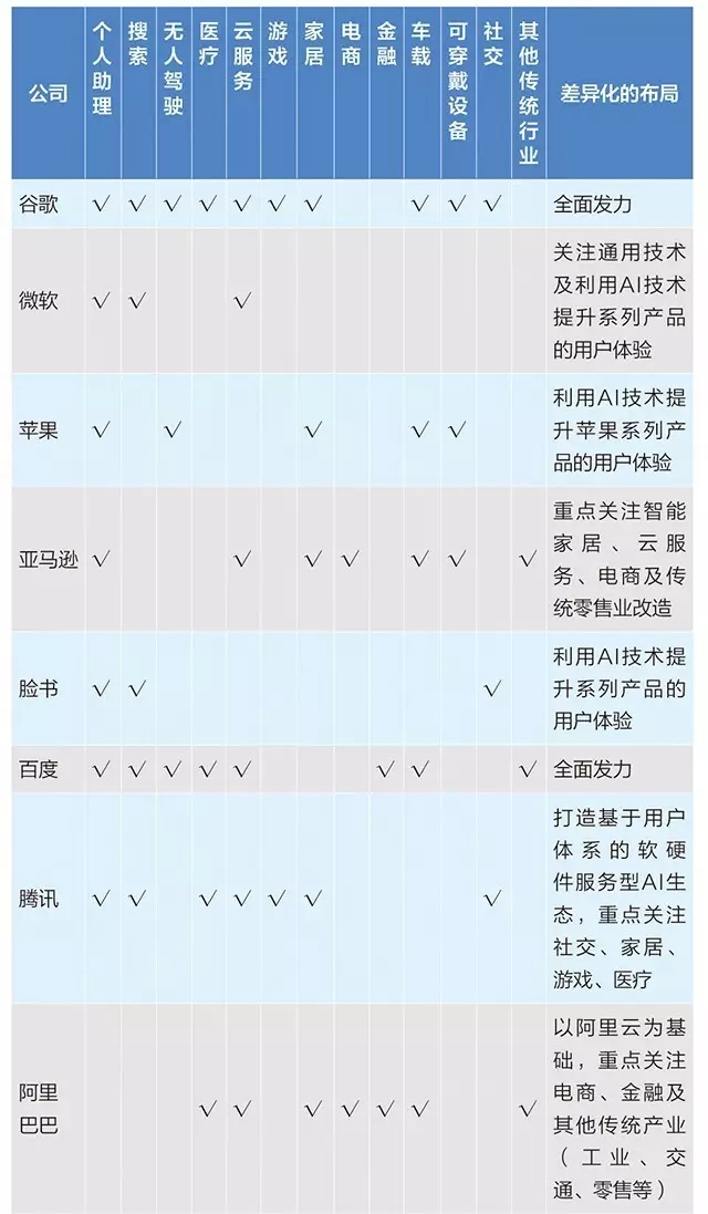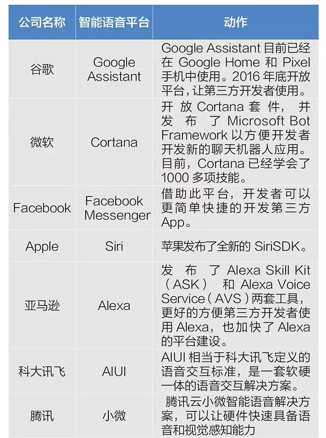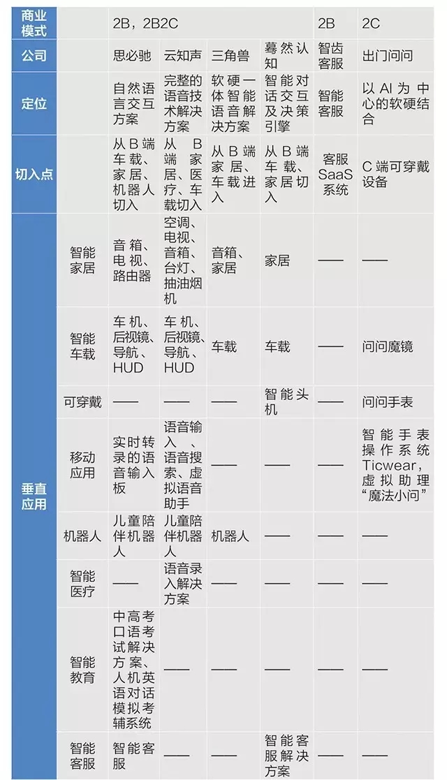创业公司则以垂直领域和细分场景为突破口,重点布局家居,车载和可穿戴设备,以及客服、金融、医疗等垂直领域。