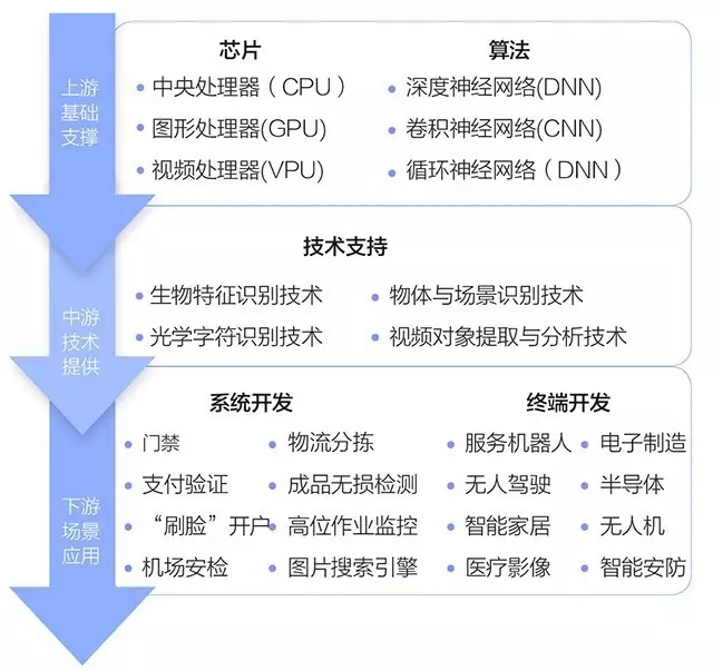 产业链上游的芯片生产和算法库开发上,国际领先的机器视觉厂商现在已实现产业化。国内企业则集中于中下游的技术提供层和场景应用层。在产业链下游,国内众多创业公司积极开拓产品线,主要在智能制造和消费两大领域。