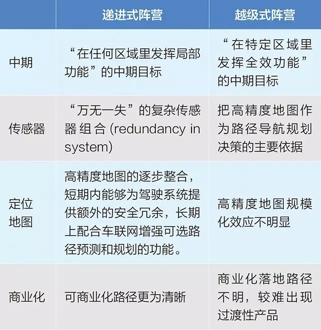 自动驾驶领域目前基本分为两大阵营: 以传统汽车厂商和 Mobileye 合作的“递进式”应用型阵营,以谷歌、百度以及初创科技公司为主的“越级式” 研究型阵营。
