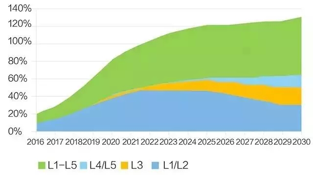 全球 L1-L5 智能驾驶市场的渗透率会在接下来 5 年内依靠 ADAS 市场的高速发展而处于高速渗透期,然后伴随半无人驾驶的普及进入稳速增长期,在来到 2025 年无人驾驶放量阶段后,依赖全产业链的配合而进入市场成熟期。