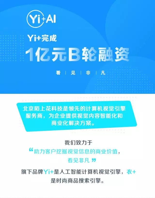 Yi+成立于2014年,是国内领先的计算机视觉服务商,致力于帮助客户“看见非凡”,挖掘视觉信息的商业价值。曾获阿里优酷土豆领投A轮融资。公司旗下品牌Yi+是通用人工智能计算机视觉引擎,衣+是时尚商品搜索引擎。