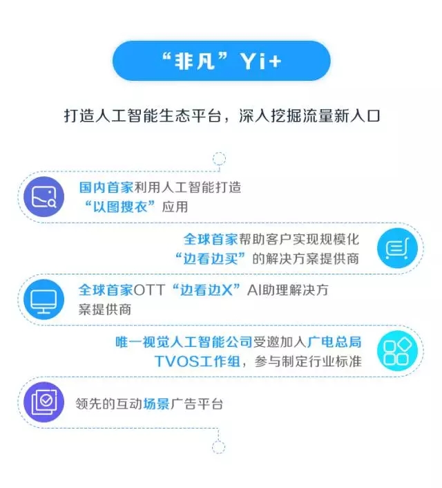 目前,Yi+以在视频、图像中的人脸、物体、场景检测、识别、搜索、推荐技术的积累,主要布局在视频媒体、智能电视、智能相机、广播电视系统等领域,提供“电视+AI”“相机+AI”及“营销+AI”的解决方案。而公司设定的目标就是快速将Yi+的解决方案嵌入到各场景与领域中,整合各种数据、流量和内容,提供端到端的服务,最终实现平台规模化。