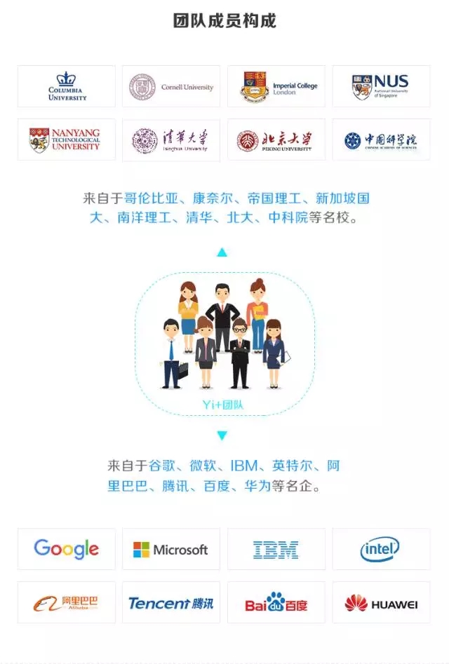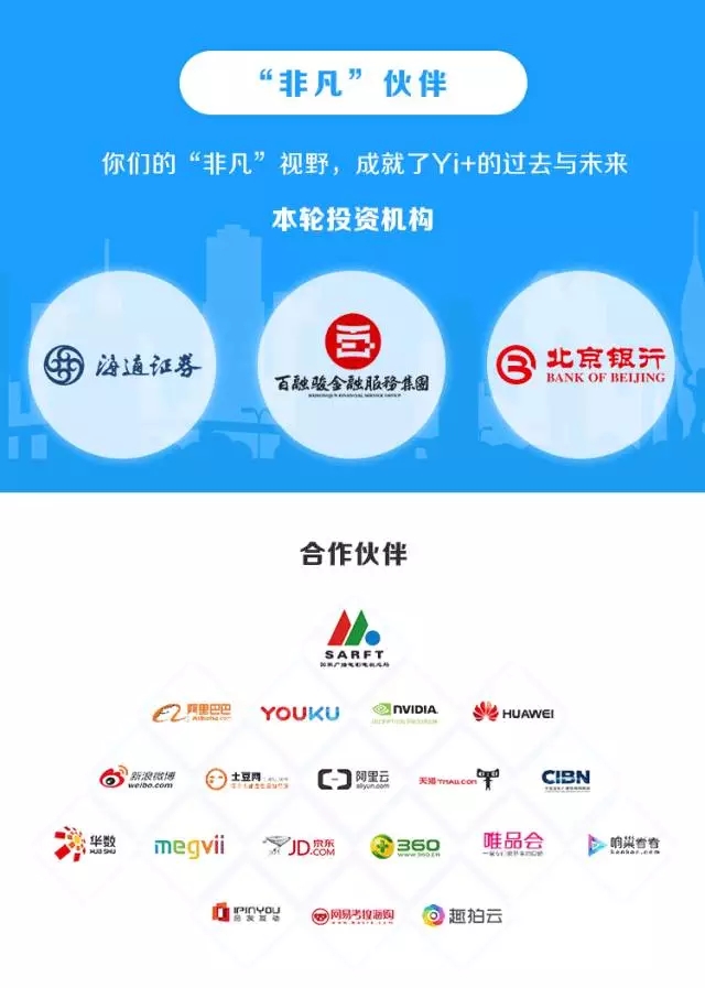 Yi+已经为阿里巴巴、优酷土豆、华为、微博、360等行业巨头, 通过基于视觉识别技术的数据结构化产品服务数亿用户,帮助媒体内容方实现智能分析、内容互动和场景营销。团队成员来自于哥伦比亚、康奈尔、帝国理工、新加坡国立、南洋理工、清华、北大、中科院等名校及谷歌、微软、IBM、英特尔、阿里巴巴、腾讯、百度、华为等名企。