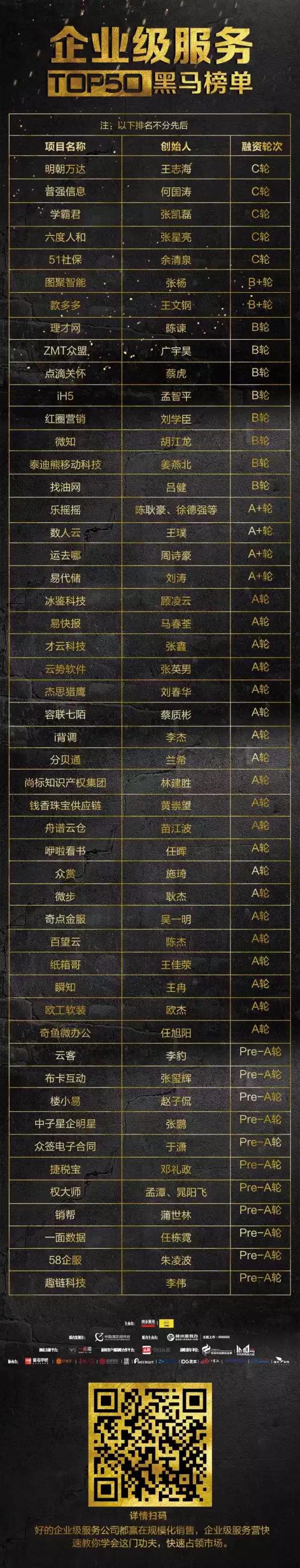 近年来,企业级服务市场迅猛发展,2C市场逐渐饱和,不计其数的创业公司和VC都将目光投向了To B市场,由腾讯发布的《中国创投领域资金风向报告》显示,企业服务是最受创业者欢迎的三个赛道之一。2017 年度黑马榜从企业级服务开启,主要针对C轮前的初创公司,目的在于发现最具独角兽气质的公司并将其推至投资人和公众面前。从百个2B相关企业中,参照可投资性、创新性、客户认可度、产业潜力、影响力五项评选指标,最终选出 50 家在技术、内容、运营等方面最具潜力的新锐公司,让他们站在时代舞台中央,引领行业变革方向。云势软件、杰思猎鹰也凭借自身的实力参与到了此次活动中,“企业级服务TOP50 黑马评选”受到很多行业人士的关注,更甚者有业内人士将其解读为 2018 年企服圈的投资风向标。