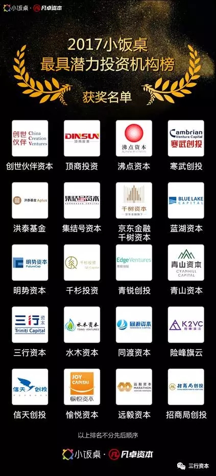 作为本次大会的重要环节,会议发布了“2017小饭桌最具潜力投资机构榜”。本次评选共收到100多家成立于2014年以后的新锐机构报名,小饭桌参考过往投资案例、行业影响力、评委会意等参数评选出20家在2017年成绩亮眼的机构授予此奖项。
