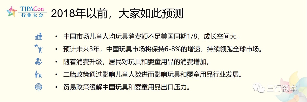 2018年结束以前很多人预测随着中国中产阶级的扩张,伴随着先进的育儿理念,新一代父母会更加重视儿童的生活品质及早期教育,促使消费者在玩具和婴童用品的消费增加。政策方面,内有二胎全面开放的利好消息,外有关税豁免政策。并且许多人乐观地预计未来几年,中国玩具市场将保持6-8%的增速,相较全球不到3%的增速,中国将会持续领跑全球市场。与发达国家相比,中国的玩具消费额不足美国同期1/8,作为这样一个人口超级大国,我们的婴童玩具市场发展潜力巨大。