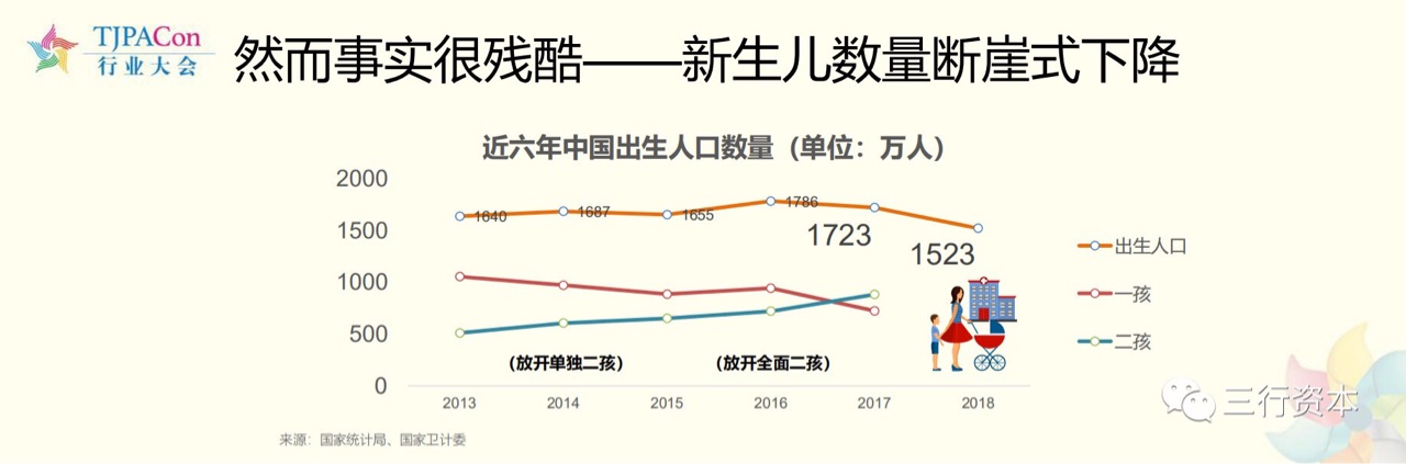 但是,2018年结束以后,市场的实际发展情况却和最初的预测大相径庭。摆在我们面前最根本且短时间无法解决的问题是,我们的人口出生数量正在面临出现了断崖式的下降,从2013年到2018年我们经历了2014年放开单独二胎的政策到2016年全面放开二胎政策,国家正在用实际行动去支持鼓励我们的新一代80后乃至90后的父母生二胎,然而从国家统计局和国家卫计委给出的最新数据来看我们从2014年至2018年的孩子出生数量从整体上还是呈下降趋势,尤其是2017至2018年我们的新生儿出生数量从1723万骤降至1523万,未来新生儿出生率是否会重新大幅度反弹目前我们不得而知,但是可以肯定的是出生率下降这个问题短时间之内不会被解决。