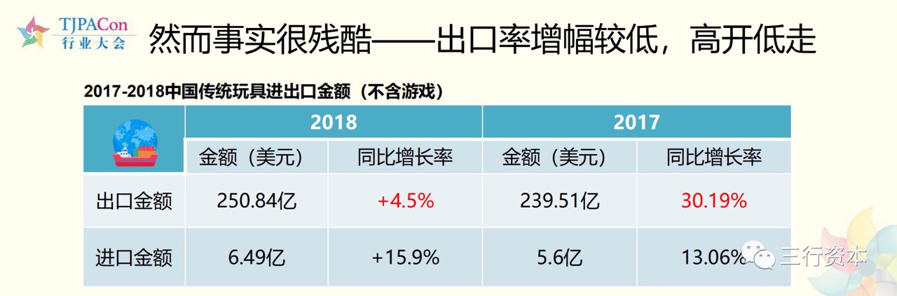 从最新的数据中发现,2017年中国传统玩具出口金额为239.51亿美元,同比增长率为30.19%。进口金额为5.6亿美元,同比增长率为13.06%。而2018年中国传统玩具出口金额为250.84亿美元,同比增长率仅为4.5%,进口金额为6.49亿美元,进口同比增长率达到15.9%。2018年传统玩具出口增长率正在面临大幅度下降,国外进口玩具同比增长率反而上升了2.3个百分点,中国传统玩具厂商正在面临异常激烈的市场竞争。
