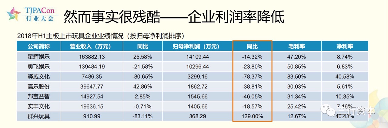 出口增长率下降,进口增长率上升伴随而来的就是中国传统玩具厂商的净利润正在大幅度下降,净利润空间被大幅挤压。从2018年H1主板上市玩具企业业绩情况来看,(按归母净利润排序)除群兴玩具净利润同比上升以外,星辉娱乐、奥飞娱乐、骅威文化、高乐股份、邦宝益智、实丰文化、等头部传统玩具企业的净利润同比都严重下降,骅威文化和邦宝益智同比净利润率下降达到78.37%和46.05%,传统玩具市场竞争相当惨烈。