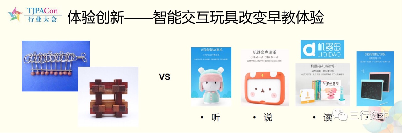 和传统的儿童玩具相比,现在的儿童玩具交互更加智能化,体验更加多样化。三行资本在2017年投资了机器岛,这家公司曾经仅靠米兔故事机这一款产品很快达到了单月10万台的销量,公司销售额从0到1.5亿仅仅用了不到一年的时间。我们事后复盘发现米兔故事机只所以能够取得如此佳绩的原因主要有三点:第一,我们经过调研问卷发现将近80%的父母给孩子使用故事机是因为他们对IPAD等带屏类电子产品非常排斥,担心这些电子产品会对孩子们的视力造成影响。第二、我们发现现在的新一代80后和90后年轻父母们虽然工作繁忙但是仍然希望能够在空闲的时候可以借助米兔故事机随时和孩子们进行实时互动交流。最后还有一个蛮有意思的现象就是我们发现一部分父母选择用米兔故事机给孩子讲故事竟然是因为他们不希望老人或阿姨的发音会影响到孩子的发音。机器岛在我们投完后用了不到一年的时间达到了单品120万台的销量,但到了2018年,我们都知道中国出现了智能音响,如喜马拉雅等类型的智能音响都出来了,又会对这类产品进行一个快速的替代。