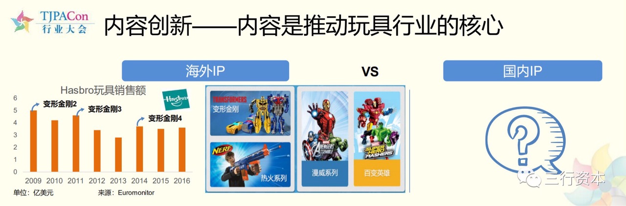 IP 和内容一定是逃不开的。当我们之前看到故事机这个方向后,却错失了一个很好的投资机会,就是“凯叔讲故事”。当我的家里边出现了《凯叔讲三国》的故事机时,我就意识到,内容的赋能、确实可以影响家长跟孩子们的消费。我问我的儿子: “你为什么特别想买一个像关公一样的故事机,其实你已经有了两台米兔一代和二代。“他说:“我特别喜欢听凯叔讲故事的里边的内容,而只有他让我才觉得这是个好故事。”但其实最早看到这种类型的企业时,我们仅仅把它当做一个内容来考虑,但殊不知内容真的会慢慢衍生成为硬件销售很重要的推手。而现在”凯叔讲故事“已经不在我们所投资的米兔故事机里面去做分发了,他在直接用他的内容影响力在控制硬件产品销量的走势。所以这一点也让我们在思考,如果当时我们投完终端以后,积极的往市场内容里边去看,我们再去做一些内容的布局,这个向上游投资的思路一定不会错。今天的手册里都有提到IP 授权的相关问题,我们也在积极讨论IP 的授权应该怎么做。行业也在积极探索新IP 如何孵化,包括三行资本投资的卓然影业,去年参与制作发行的《白蛇缘起》这部动画片也取得了国内第二大动画片的票房。但我们真的发现,如果想制造出一款在小朋友心目中的优质IP还是蛮难的。但是同时我们也看到一个好的IP 就像一个好的内容,的的确却可以非常大的促进一款玩具的销量,增强一个玩具企业的生命力。所以我们在思考,到底下一个爆款IP 在哪?怎么能够做好有效的授权,做好自己的研发?这可能是每一个从业者需要深思的问题。