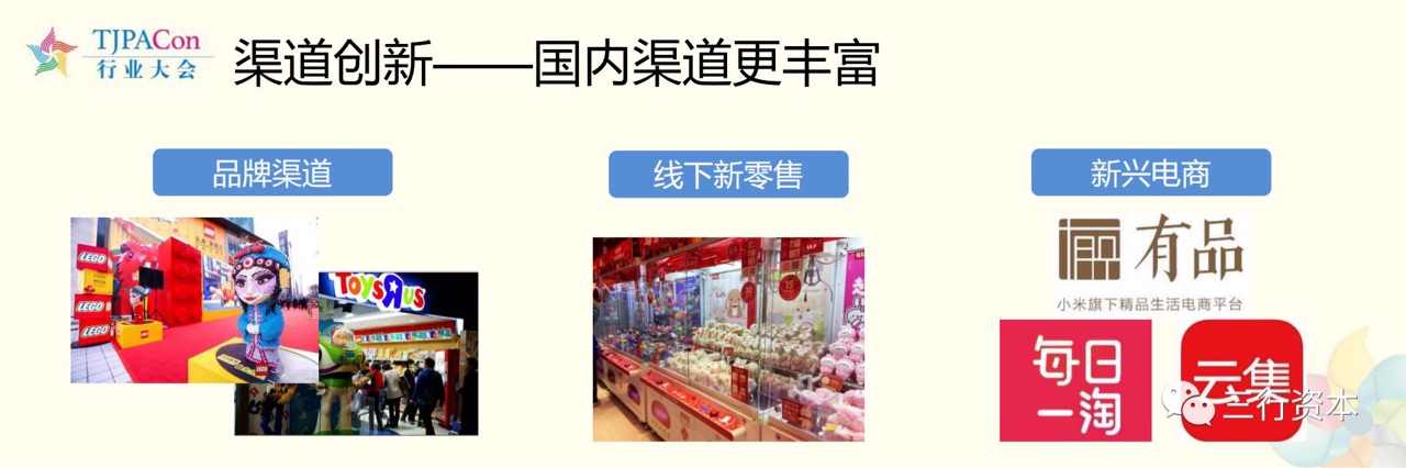 美国有一个特别有趣的玩具宣传渠道叫Ryan Toysreview, 这是个七岁的小朋友,去年在Youtube排名它竟然以2200万美金,相当于1.5亿人民币的销售额排到Youtube收入排行榜的第一名,这是他自带的流量。其实它干的事情很简单,他就是以他独特的视角,把他喜欢的玩具,从拆箱到测试到完成以后,录制成视频上传到Youtube,从而带动这个销售。俘获了全球1834万个粉丝。而在中国同样有抖音和快手一样的新兴视频渠道,是否会出现比较有趣的玩具网红通过粉丝的效应去带动玩具产品的销量。