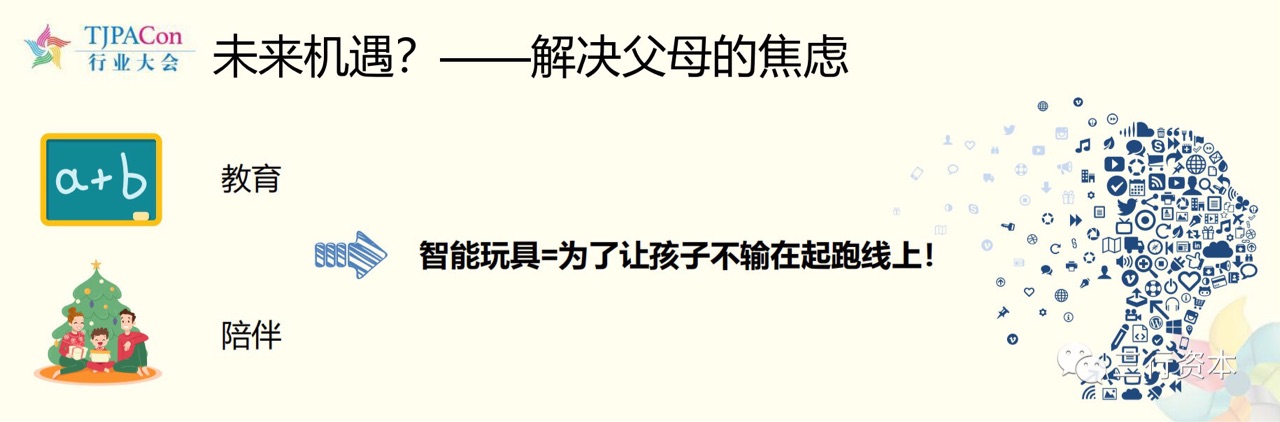 所以,最重要的机会还是在于如何能够缓解父母的焦虑,新兴的一些教育类的产品,一定还是我们投资的重点。也希望在座企业家来告诉我们,哪些方向可以跟我们有很好的结合。例如,平衡车,滑板车、儿童牙刷,虽不属于玩具,但也是增长非常快的品类,我们也会布局。但真正玩具相关的好的东西是什么?80后90后父母会给孩子买什么类型的玩具?10后他们都喜欢什么玩具?所以只有抓住家长焦虑的这样一个思维。——希望孩子们永远不要输在起跑线上,一定会创新出更好的产品。