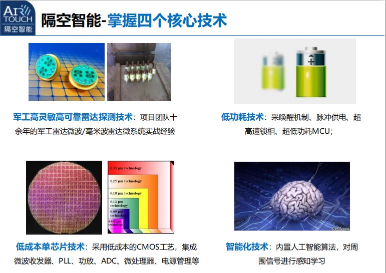 目前,公司已经掌握四个核心技术,分别是:1.军工高灵敏高可靠雷达探测技术;2.低功耗技术;3.低成本单芯片技术;4.智能化技术。