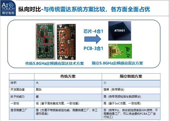 对比传统的热释电红外传感器:与传统的热释电红外传感器相比,微波雷达感应具备抗干扰能力强、灵敏度高、距离远、易集成、无遮蔽困扰、不受环境温度影响等优点,同时也克服了传统微波雷达感应模组采用分离器件搭建,成本高一致性差,难以规模化推广等问题。