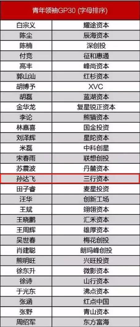 三行资本创始合伙人孙达飞先生在中国众多优秀投资人当中,通过多轮淘汰和选拔,最终成功入选中国股权投资「青年领袖GP30」。