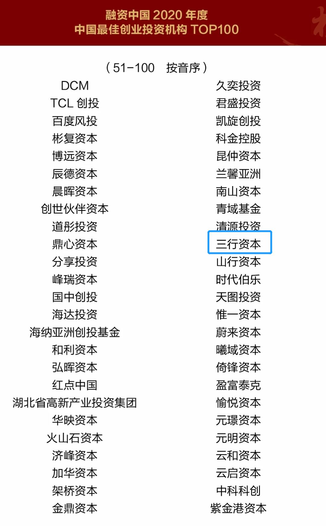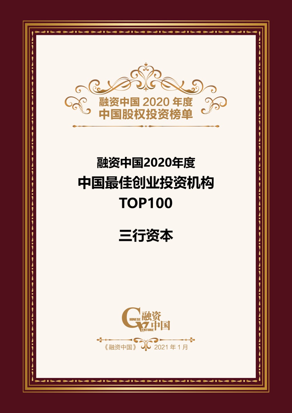 三行资本荣获“中国最佳创业投资机构TOP100”