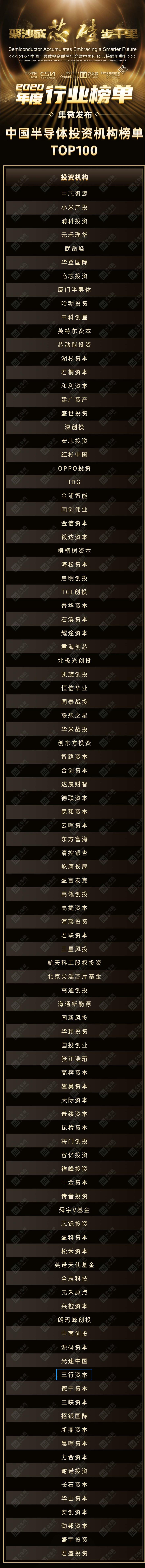 2021年1月16日,第二届中国半导体投资联盟年会暨中国IC风云榜颁奖典礼在北京举办。本次活动主题为“聚沙成芯 硅步千里”,由中国半导体投资联盟年会和集微网共同主办。在大会上,“中国半导体投资机构榜单TOP100”揭晓,三行资本光荣上榜。