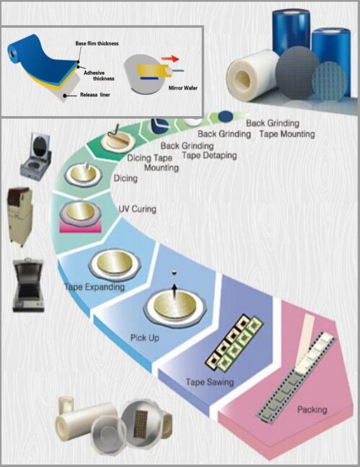 半导体电子领域包含消费电子、半导体、新型显示。上图是应用于半导体的晶圆切割膜、减薄膜。灰色的是晶圆,蓝色的是切割膜或减薄膜。在对晶圆进行切割前,将切割膜贴在晶圆正面,切割膜能防止芯片在切割时散落,当切割完成后,通过 UV 照射,使切割膜失去粘性后取下。有些功能的芯片为了更好的散热,需要在切割前对晶圆背面进行减薄,于是需要使用减薄膜。将减薄膜贴于晶圆正面,可固定并保护晶圆,进行磨片减薄后,再进行切割。