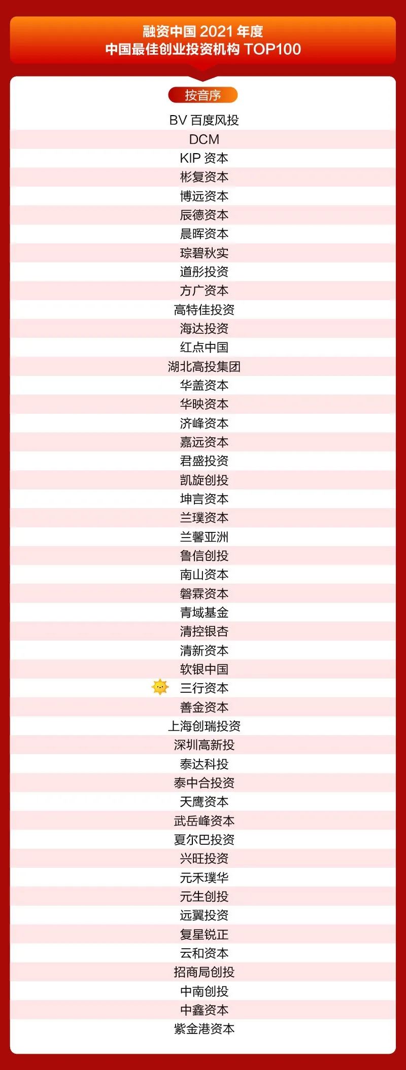 2022年1月13日,融资中国2022(第11届)资本年会暨颁奖盛典在上海举行,【扬帆远航】融资中国2021年度股权投资榜单隆重揭晓。三行资本凭借2021年在股权投资“募、投、管、退”出色的综合战绩,荣誉跻身“中国最佳创业投资机构TOP100”!