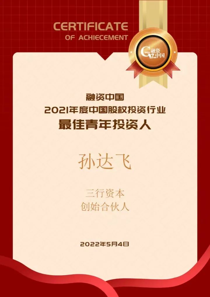 2022年5月4日,融资中国首次评选“2021年度中国股权投资行业最佳青年投资人”,根据融中研究数据库及历届问卷,结合参评人所在机构/团队资金管理规模,参评人募资/投资能力、项目退出能力、综合评估体系等指标,经过扎根调研、数据评估,最终评选出了100位“2021年度中国股权投资行业最佳青年投资人”。三行资本创始合伙人、CEO孙达飞荣耀当选!