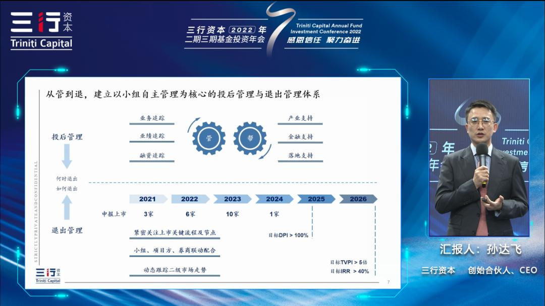 三行资本创始合伙人、CEO孙达飞开篇向投资人汇报了二期基金亮眼的投资成绩:二期基金所投项目中,收获3家独角兽、2家准独角兽,20家预上市企业,成功构建“3+2+20”优质投资组合。更为难能可贵的是,三行均在企业早期轮次融资时进入前述5家独角兽:3家为A轮投进,投后估值不足10亿;2家为B轮投进,1家投后估值不足20亿,1家投后估值约40亿。